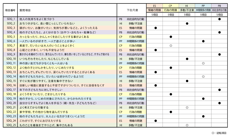 困難さ(difficulties):情緒の問題、行為の問題、多動/不注意、仲間関係の問題、の4下位尺度20項目